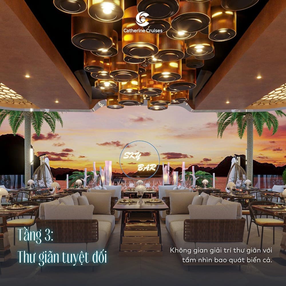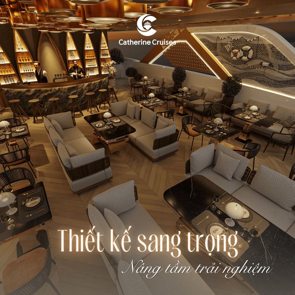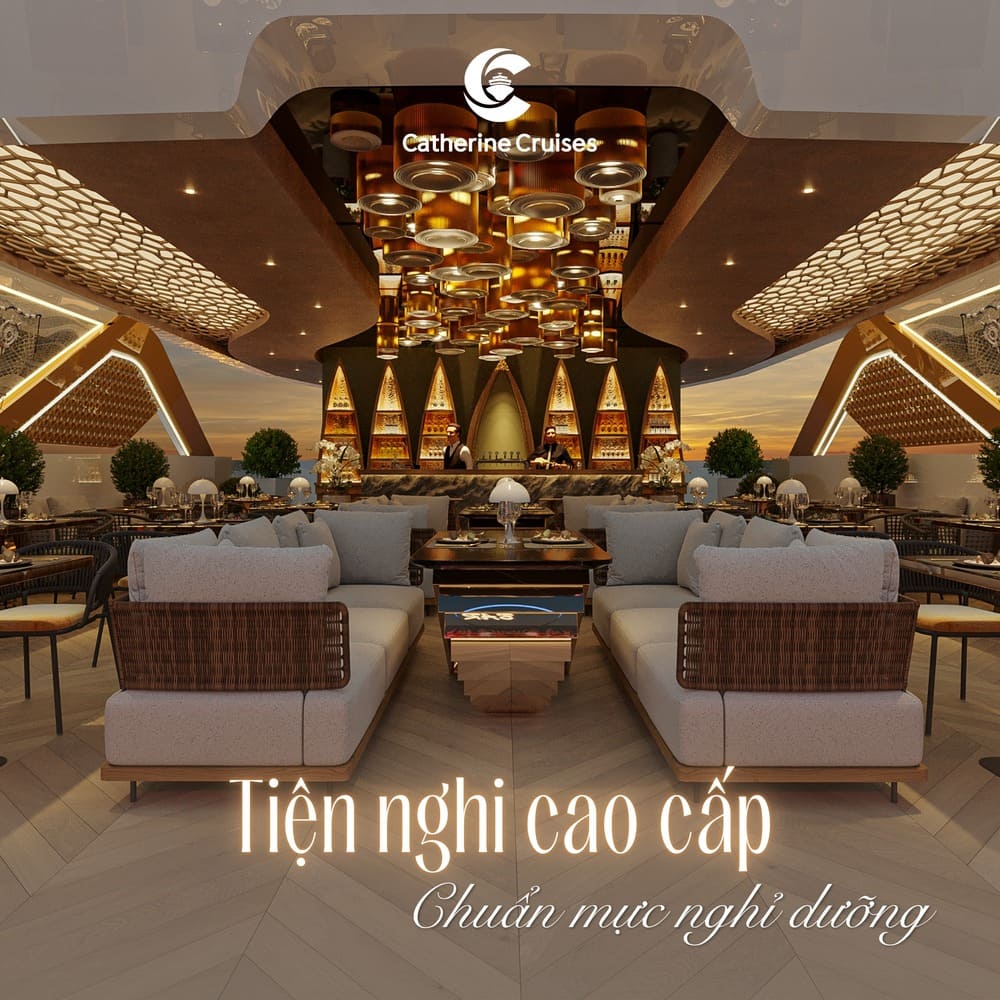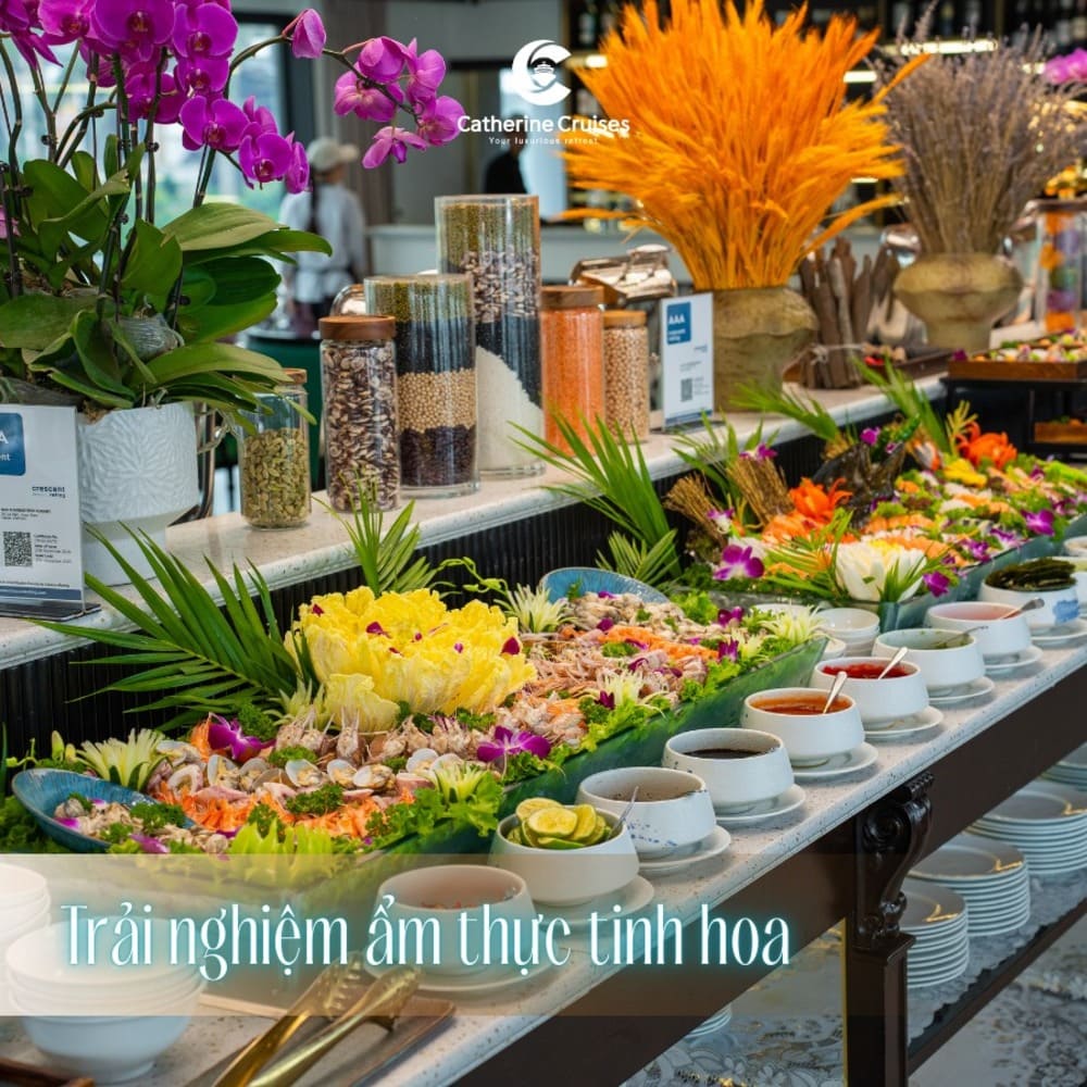 | 08:15 – Đón khách tại Nhà chờ riêng Lô 42 Cảng Tuần Châu, Hạ Long. Thưởng thức đồ uống chào mừng và nghe giới thiệu về du thuyền Catherine Horizon & lịch trình. 09:15 – Du thuyền khởi hành, tham quan Vịnh Hạ Long (Di sản thiên nhiên thế giới). Ngắm núi đá vôi hùng vĩ, thư giãn trên boong tàu, bể bơi bốn mùa hoặc nhà hàng sang trọng. 10:15 – Tham quan Động Mê Cung – một trong những hang động đẹp và độc đáo. Tham quan Làng nghề nuôi cấy ngọc trai nổi tiếng. 12:15 – Thưởng thức bữa trưa cao cấp trên du thuyền với ẩm thực Á – Âu và hải sản tươi ngon. 14:00 – Tham quan Hang Trinh Nữ: chèo kayak, tham quan động, tắm biển hoặc thư giãn giữa thiên nhiên. (Hoạt động có thu phí) 15:15 – Du thuyền quay lại cảng. Thưởng thức tiệc Canapé, nhạc sống, ngắm cảnh vịnh và thư giãn. 16:30 – Cập cảng Tuần Châu, kết thúc hành trình. | 08:15 – Đón khách tại Nhà chờ riêng Lô 42 Cảng Tuần Châu, Hạ Long. Thưởng thức đồ uống chào mừng và nghe giới thiệu về du thuyền Catherine Horizon & lịch trình. 09:15 – Du thuyền khởi hành, tham quan Vịnh Hạ Long. Ngắm núi đá vôi hùng vĩ, thư giãn trên boong tàu, bể bơi hoặc nhà hàng sang trọng. 10:15 – Tham quan Hang Sửng Sốt – hang động đẹp và nổi tiếng. Tham quan Đảo Ti Tốp, leo núi ngắm toàn cảnh vịnh từ trên cao. 12:15 – Thưởng thức bữa trưa cao cấp trên du thuyền với ẩm thực Á – Âu và hải sản tươi ngon. 14:00 – Tham quan Hang Trinh Nữ: chèo kayak, tham quan động, tắm biển hoặc thư giãn giữa thiên nhiên. (Hoạt động có thu phí) 15:15 – Du thuyền quay lại cảng. Thưởng thức tiệc Canapé, nhạc sống, ngắm cảnh vịnh và thư giãn. 16:30 – Cập cảng Tuần Châu, kết thúc hành trình. |