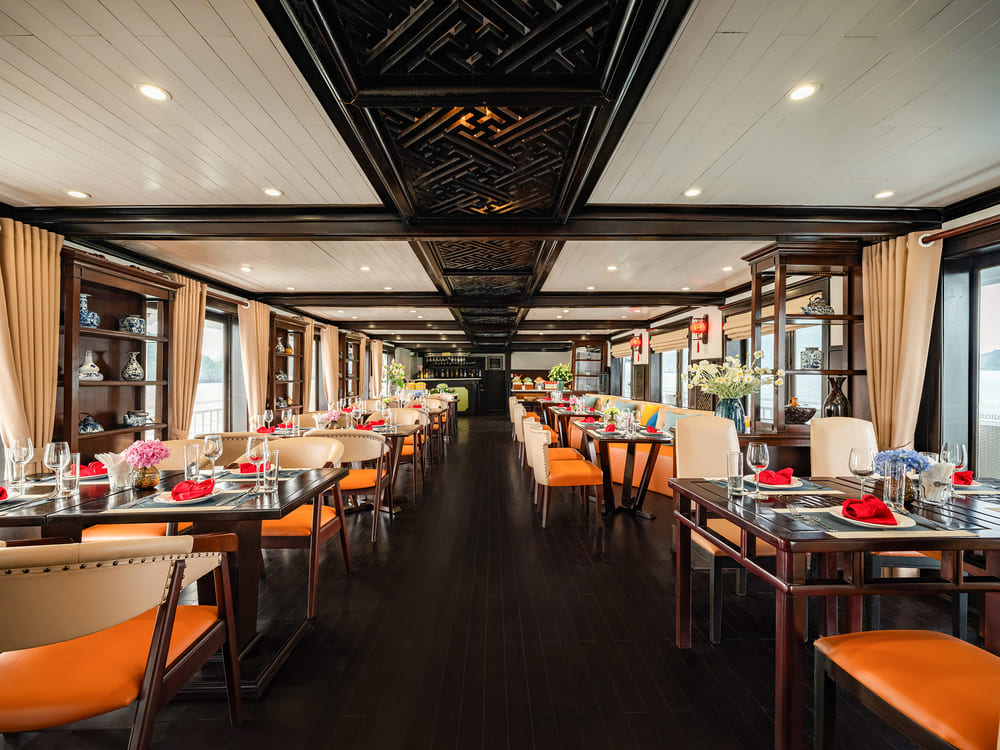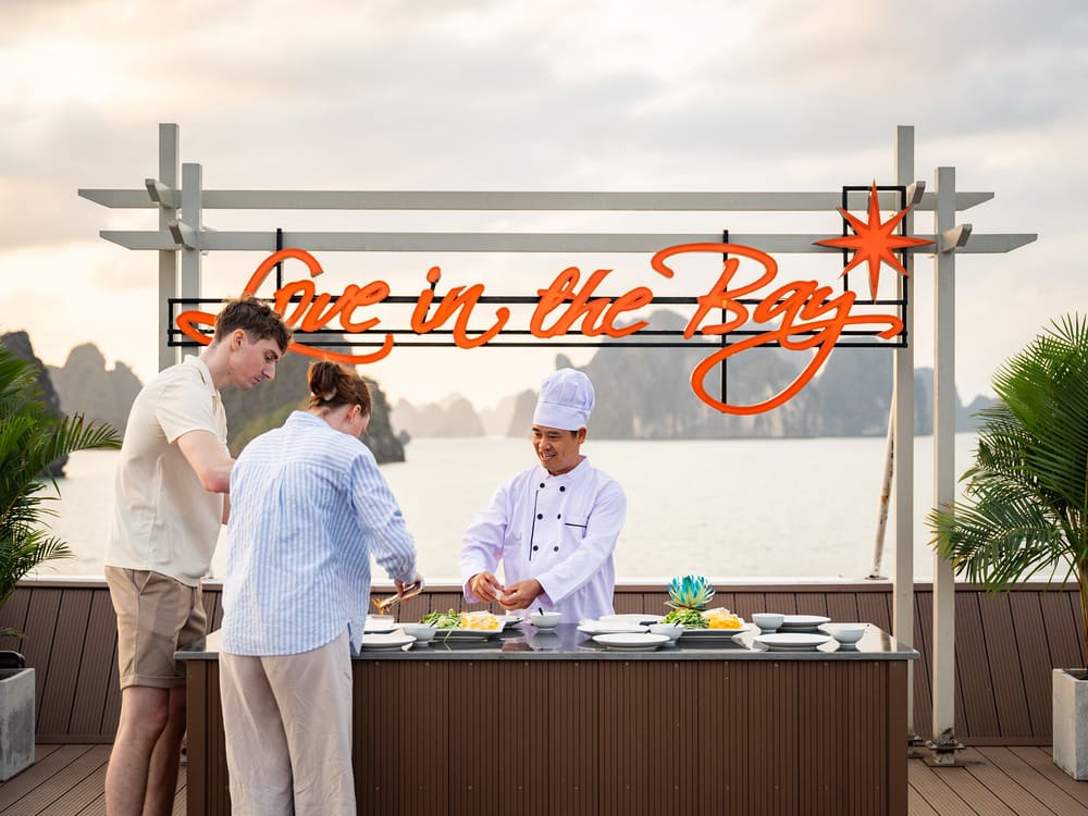 13:00 – Quý khách thưởng thức bữa trưa buffet trong khi du thuyền nhẹ nhàng lướt qua những dãy núi đá vôi hùng vĩ của Vịnh Hạ Long.