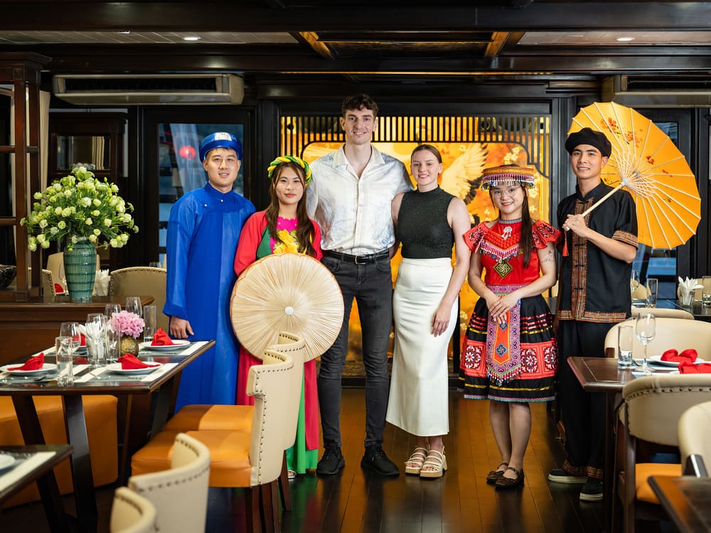 20:30 – Sau ăn tối: Sau khi ăn tối xong, Quý khách sẽ tận hưởng khung cảnh yên bình của Vịnh vào ban đêm trên boong tàu. Quý khách cũng có thể tham gia các hoạt động không tính phí vào buổi tối như xem trình diễn thời trang phong tục truyền thống “Bước chân di sản” và chụp hình kỷ niệm, câu mực đêm, hát Karaoke, chơi Boardgame chiêm ngưỡng khung cảnh yên bình của Vịnh Hạ Long vào ban đêm.